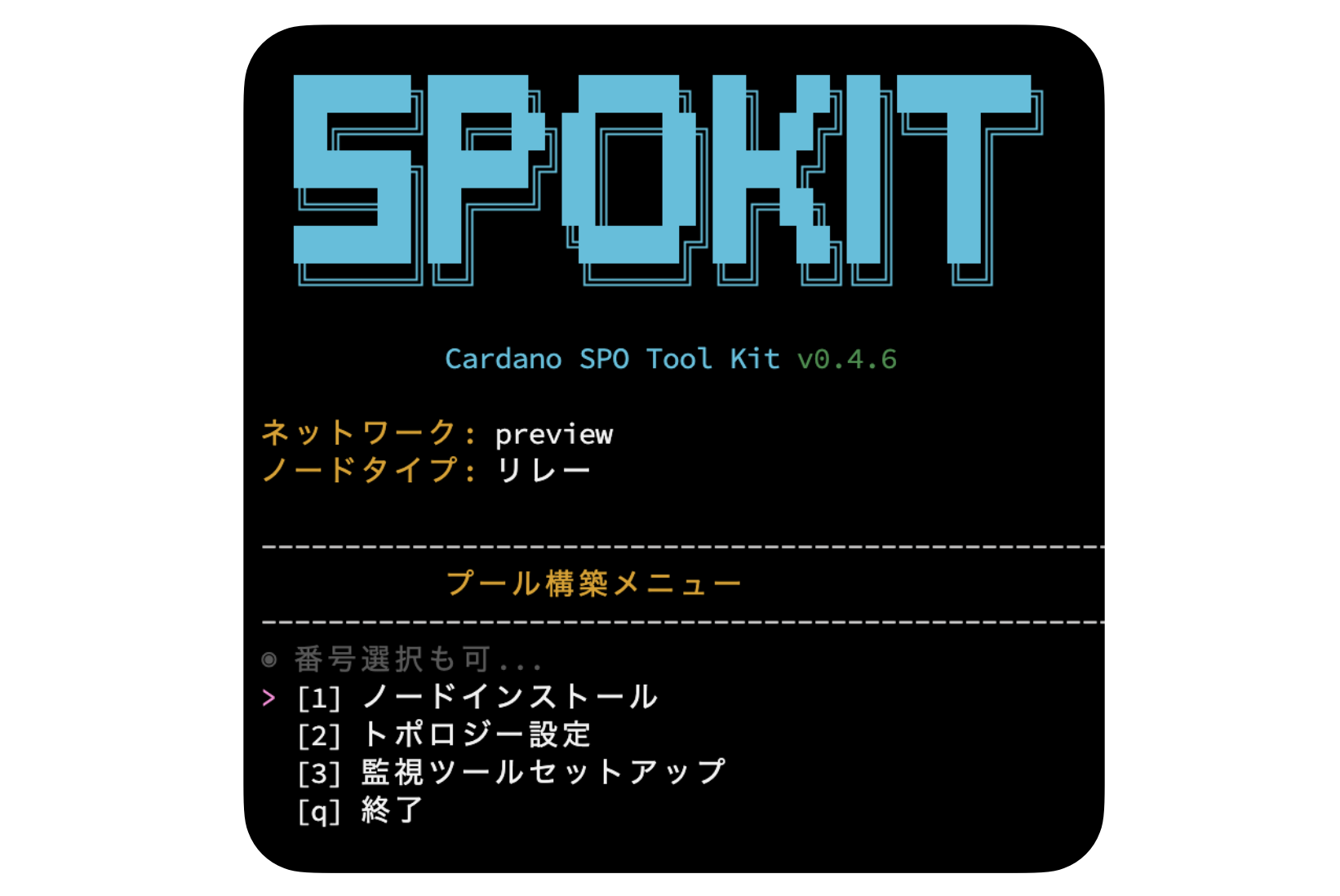 > 戻る」が表示されたら Enter を押下後、「[q] 終了」を選択し、SPOKITウィザードを閉じます。 -