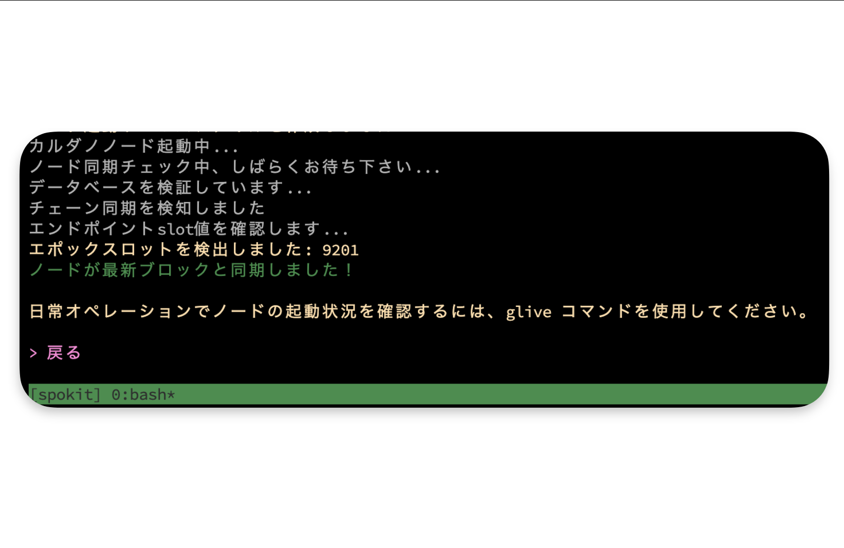 gLive が表示されていれば、ノードは正常に起動しています。