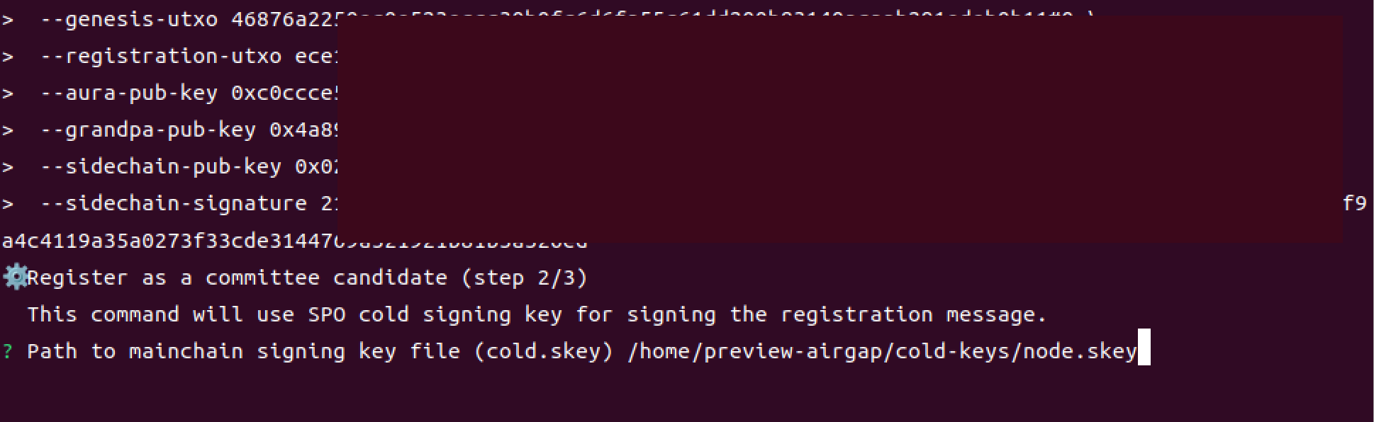 midnight-node wizards register3のコマンドが出力されるのでメモ帳などにコピー$HOME/cold-keysディレクトリのロックします。