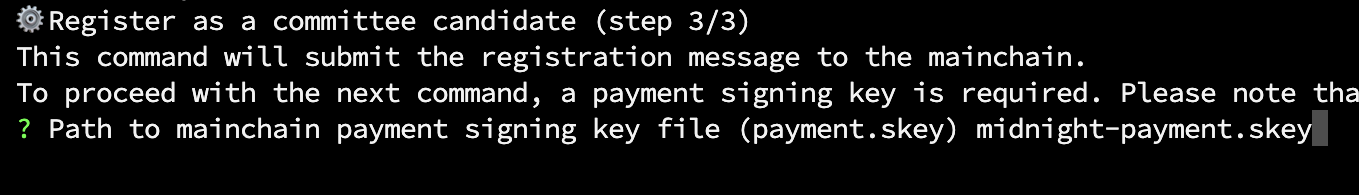 ? Path to mainchain payment signing key fileでは、以下を入力して Entermidnight-payment.skey