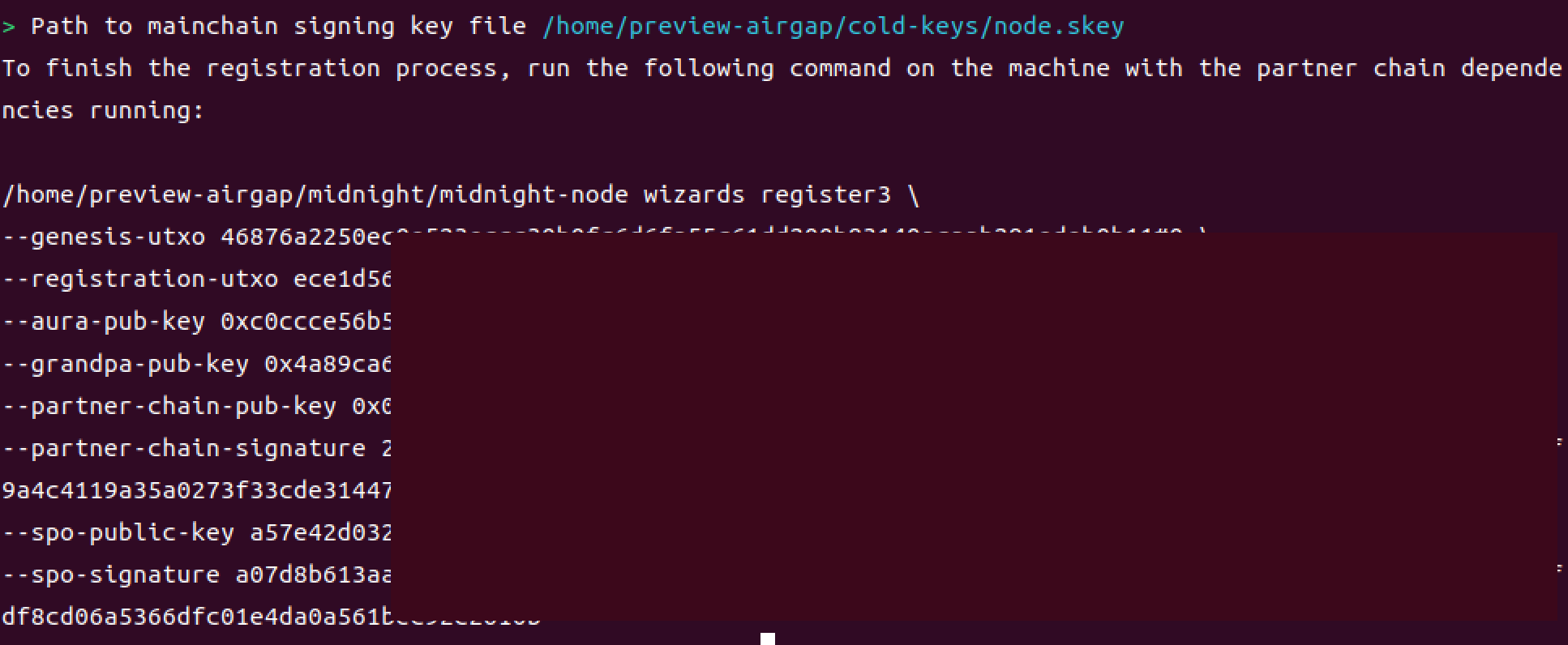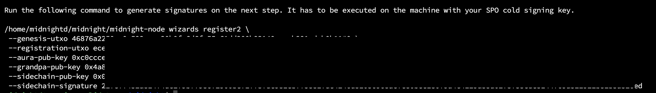 cd $HOME/midnight CFG_PRESET=${MIDNIGHT_NETWORK} ./midnight-node wizards register1 -