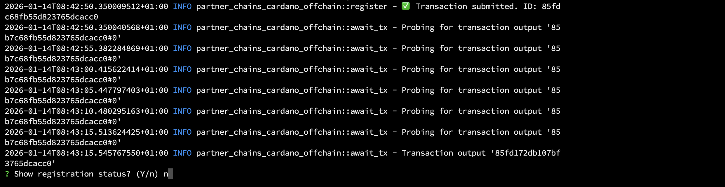 ? Path to mainchain payment signing key file→midnight-payment.skey> Ogmios protocol (http/https)→https> Ogmios hostname (localhost)→ogmios.testnet-02.midnight.network> Ogmios port→443Show registration status?(Y/n)が表示されたらnを入力
