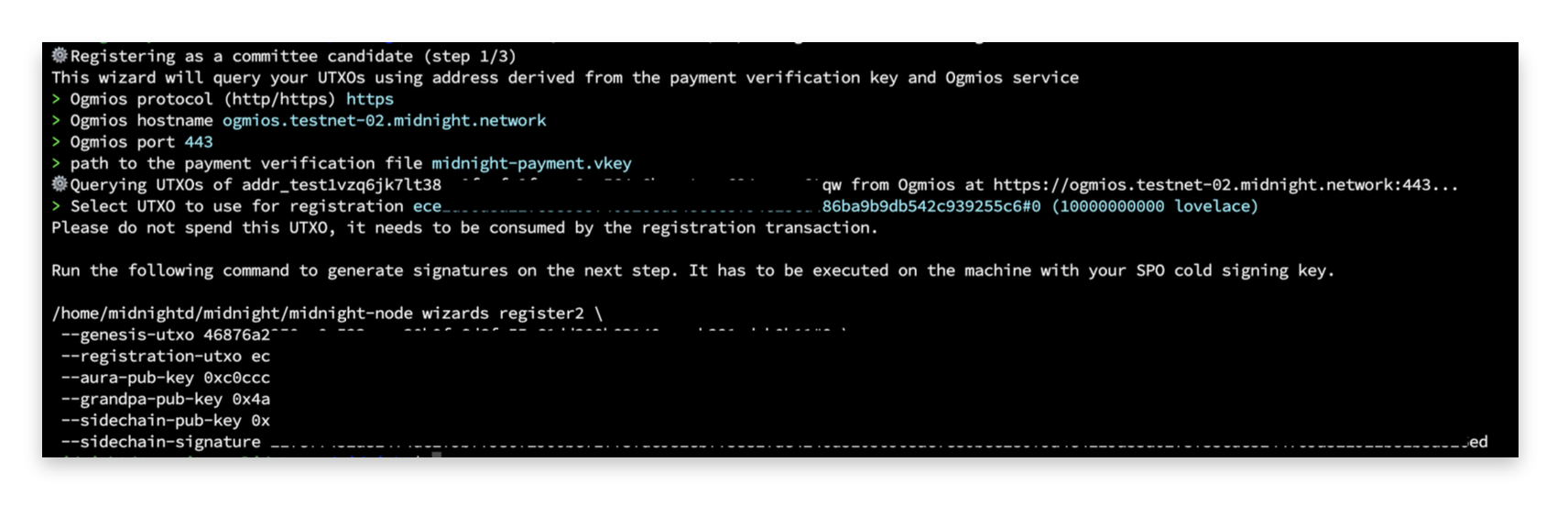 > Ogmios protocol (http/https)→https> Ogmios hostname (localhost)→ogmios.testnet-02.midnight.network> Ogmios port→443> path to the payment verification file→midnight-payment.vkey? Select UTXO to use for registration→ Entermidnight-node wizards register2のコマンドが出力されるのでメモ帳などにコピー
